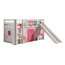 PINO Lit mezzanine avec toboggan pin massif Blanc + Spring Rideau et 3 pochettes