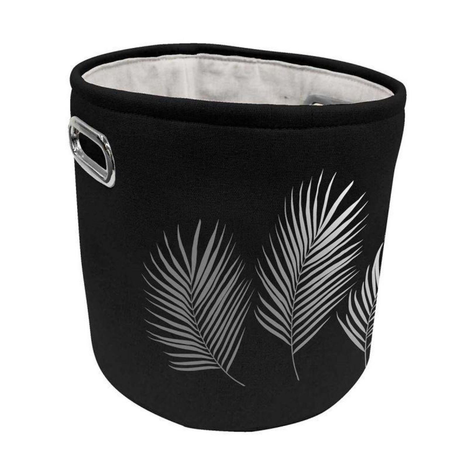 Informations Techniques : Dimensions : D. 30 x H. 28 cm Matière : 70% Polyester & 30% Coton Spécificités : Pratique & Tendance Panier de Rangement Forme Ronde Imprimé Poids : 0,502 kg Couleur : Noir & Argent