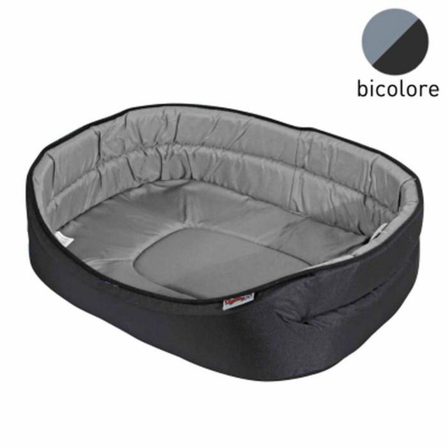 Informations Techniques : Dimensions : L. 80 x l. 63 cm Matière : Textile Spécificités : Pratique & Efficace Panier Design Forme Ovale Bicolore Pour Chiens & Chats Couleur : Noir & Gris