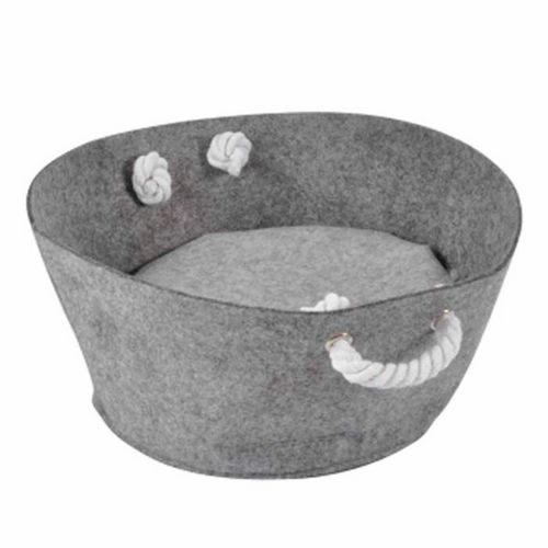Informations Techniques : Dimensions : L. 40 x l. 30 x H. 18 cm Matière : Feutrine Spécificités : Pratique & Efficace Panier Chat & Chien Avec Anses en Corde Couleur : Gris Clair