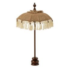 Informations Techniques : Dimensions : D. 52 x H. 87 cm Matières : Tissu & Bois Spécificités : Déco & Tendance Parasol sur pied Avec pompons Forme ronde Usage intérieur Poids : 0,72 kg Couleur : Beige