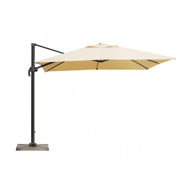 Informations Techniques : Dimensions : L. 300 x l. 300 x H. 255 cm Envergure : L. 300 x l. 300 cm Baleines : L. 17 x l. 25 x H. 1 mm Mât : L. 50 x l. 78 x H. 1,6 mm Matières : Toile : Polyester (250 g/m²) Structure : Aluminium Spécificités : Parasol déporté Rotation à 360° Inclinable verticalement H