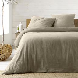 Informations Techniques : Dimensions : Housse de couette : L. 240 x l. 220 cm Taies d'oreiller : L. 63 x l. 63 cm Matière : 100% Gaze de coton Spécificités : Douce & Respirante Parure de lit 3 pièces unicolore Pour 2 personnes Fermeture à pression Contient : 1 housse de couette 2 taies d'oreiller En