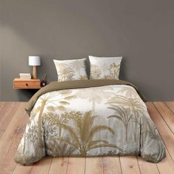 Informations Techniques : Dimensions : Housse de couette : L. 240 x l. 220 cm Taie d'oreiller : L. 63 x l. 63 cm Matière : 100% Coton (42 fils) Spécificités : Déco & Douce Parure de lit 3 pièces Pour 2 personnes Imprimé palmier Finition avec pressions Contient : 1 x housse de couette 2 x taies d'or