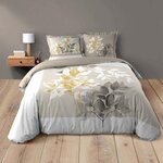 Informations Techniques : Dimensions : Housse de couette : L. 240 x l. 220 cm Taies d'oreiller : L. 63 x l. 63 cm Matière : 100% Coton Spécificités : Confortable & Doux Parure de lit 3 pièces Pour 2 personnes Imprimé végétal Fermeture à pression Label Oeko-Tex Contient : 1 housse de couette 2 taies