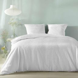 Informations Techniques : Dimensions : Housse de couette : L. 240 x l. 220 cm Taies d'oreiller : L. 63 x l. 63 cm Matière : 100% Polyester Spécificités : Tendance & Moderne Parure de lit 3 pièces Pour 2 personnes Finition gaufrée Fermeture à pression Label Oeko-Tex Contient : 1 housse de couette 2 t