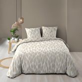 Informations Techniques : Dimensions : Housse de couette : L. 240 x l. 220 cm Taie d'oreiller : L. 63 x l. 63 cm Matière : 100% Coton (57 fils/cm²) Spécificités : Confortable & Réversible Parure de lit 3 pièces Pour 2 personnes Imprimé feuille Fermeture avec pressions Certification Oeko-Tex Contient
