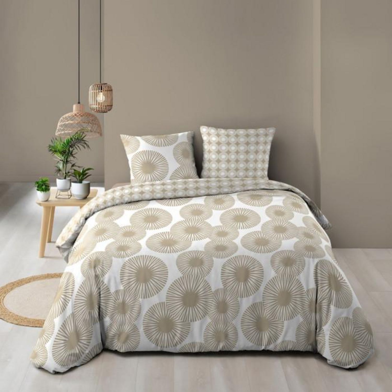 Informations Techniques : Dimensions : Housse de couette : L. 240 x l. 220 cm Taies d'oreiller : L. 63 x l. 63 cm Matière : 100% Coton Spécificités : Confortable & Réversible Parure de lit 3 pièces Pour 2 personnes Motif imprimé Fermeture à pression Label Oeko-Tex Contient : 1 housse de couette 2 ta