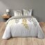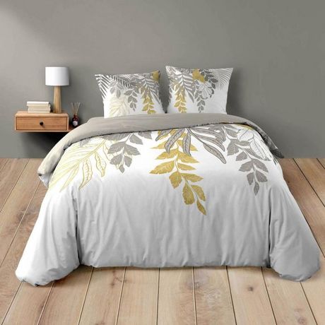 Informations Techniques : Dimensions : Housse de couette : L. 240 x l. 220 cm Taies d'oreiller : L. 63 x l. 63 cm Matière : 100% Coton Spécificités : Confortable & Moderne Parure de lit 3 pièces Pour 2 personnes Imprimé végétal Fermeture à pression Contient : 1 housse de couette 2 taies d'oreiller E