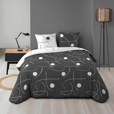 Informations Techniques : Dimensions : Housse de couette : L. 240 x l. 220 cm Taie d'oreiller : L. 63 x l. 63 cm Matière : 100% Polyester Spécificités : Moderne & Réversible Parure de lit 3 pièces Pour 2 personnes Imprimé géométrique Tissu microfibre Finition avec pressions Contient : 1 x housse de