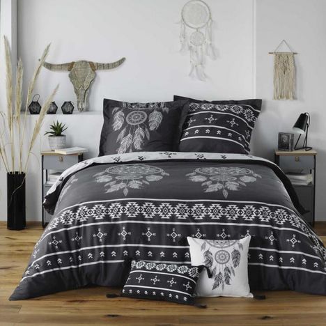 Informations Techniques : Dimensions : Housse de couette : L. 240 x l. 220 cm Taies d'oreiller : L. 63 x l. 63 cm Matière : 100% Coton Spécificités : Confortable & Moderne Parure de lit 3 pièces Pour 2 personnes Imprimé attrape-rêve Contient : 1 housse de couette 2 taies d'oreiller Densité : 52 fils