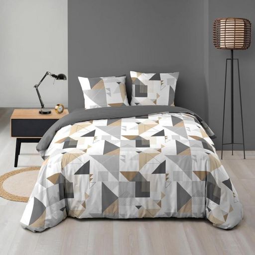 Informations Techniques : Dimensions : Housse de couette : L. 240 x l. 220 cm Taie d'oreiller : L. 63 x l. 63 cm Matière : 100% Polyester Spécificités : Moderne & Pratique Parure de lit 3 pièces Pour 2 personnes Imprimé géométrique Tissu microfibre Finition avec pressions Contient : 1 x housse de c