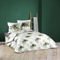 Parure de lit Tropi palmy. ,Douceur d'Intérieur. 100% coton. Tissage 42 fils/cm2. Coloris blanc. Imprimé tropical tendance. Motifs palmiers. Univers exotisme et voyage. Housse de couette