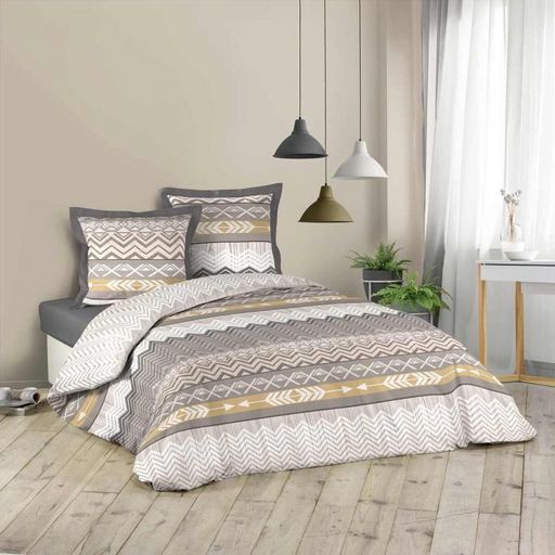 Informations Techniques : Dimensions : Housse de couette : L. 240 x l. 220 cm Deux taies d'oreiller : L. 63 x l. 63 cm Matière : Coton (42 fils/cm2) Spécificités : Design & Pratique Contient 2 taies d'oreiller & 1 housse de couette Imprimé ethnique Poids : 1.6 kg Couleur : Gris