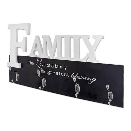 Informations Techniques : Dimensions : L. 50 x l. 7 x H. 29 cm Matière : MDF Spécificités : Pratique & Utile Patère murale 4 crochets chromés Inscription Family Poids : 1,26 kg Couleur : Blanc & Noir