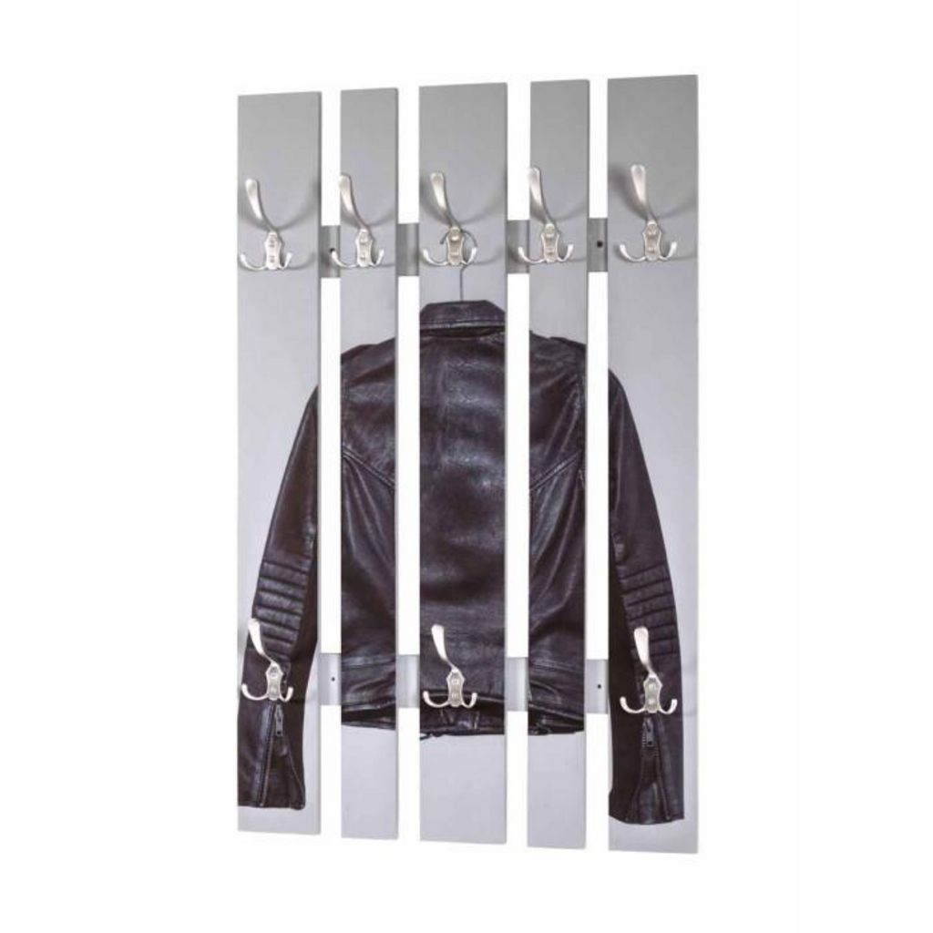 Informations Techniques : Dimensions : L. 65 x l. 9 x H. 100 cm Matière : MDF Spécificités : Déco & Pratique Patère Murale Motif Blouson en Cuir 8 Crochets Nombre de colis : 1 Poids : 5,67 kg Couleur : Gris & Noir