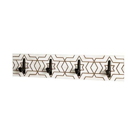 Informations Techniques : Dimensions : L. 60 x l. 6 x H. 13 cm Matières : MDF & Métal Spécificités : Pratique & Tendance Patère Murale 4 Crochets Imprimé Fraisé Effet Laqué Livré monté Nombre de colis : 1 Poids : 0,846 kg Couleur : Blanc & Noir
