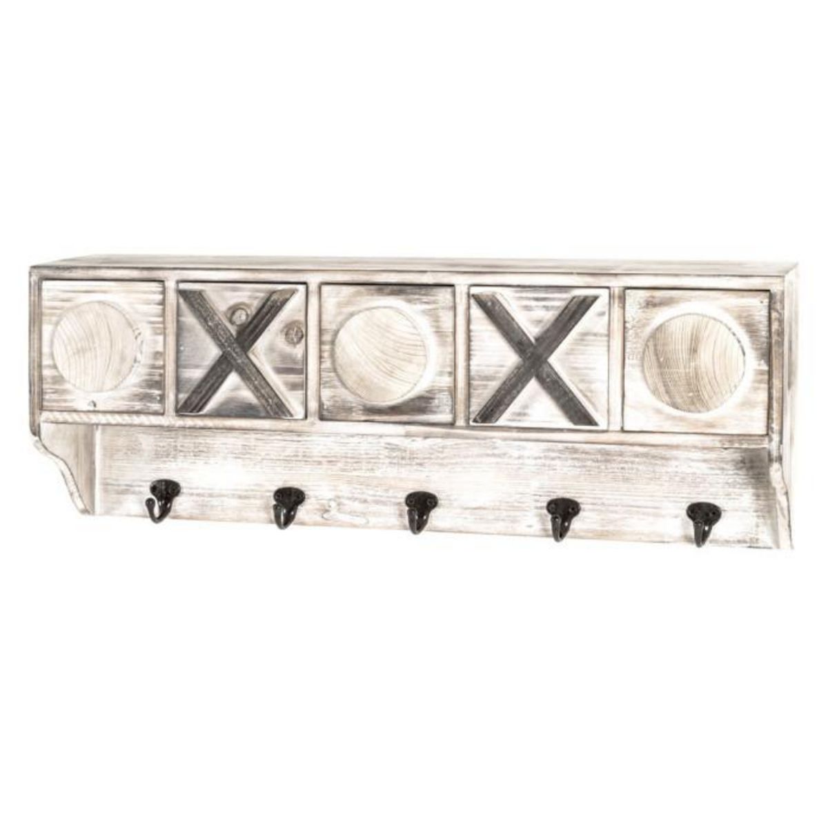 Informations Techniques : Dimensions : L. 65 x l. 15 x H. 25 cm Matière : Bois Spécificités : Vintage & Pratique Patère Murale design 5 Crochets 5 Tiroirs Livré Monté Nombre de colis : 1 Poids : 3,42 kg Couleur : Vert