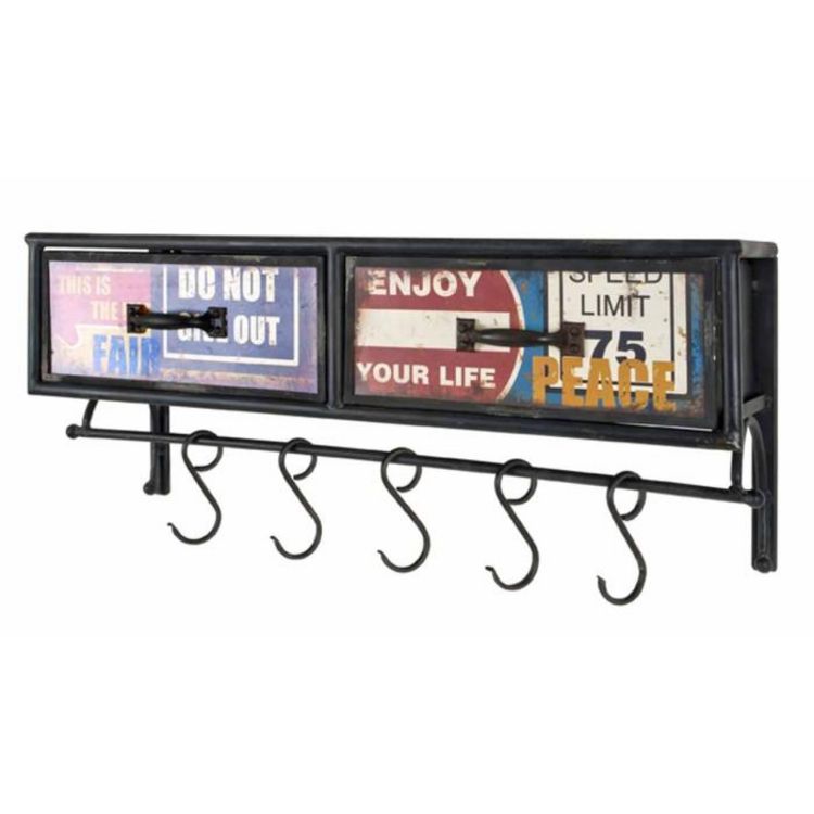 Informations Techniques : Dimensions : L. 77 x l. 24 x H. 34 cm Matière : Métal Spécificités : Vintage & Original Patère Murale 5 Crochets 2 Tiroirs A Motifs Nombre de colis : 1 Poids : 5,85 kg Couleur : Noir