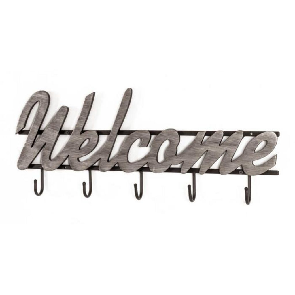 Informations Techniques : Dimensions : L. 60 x l. 4 x H. 24 cm Matières : MDF & Métal Spécificités : Tendance & Pratique Patère murale Inscription Welcome 5 crochets Finition laquée Facile d'utilisation & d'entretien Nombre de colis : 1 Poids : 0,81 kg Couleur : Noir & Gris