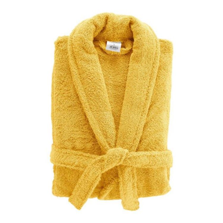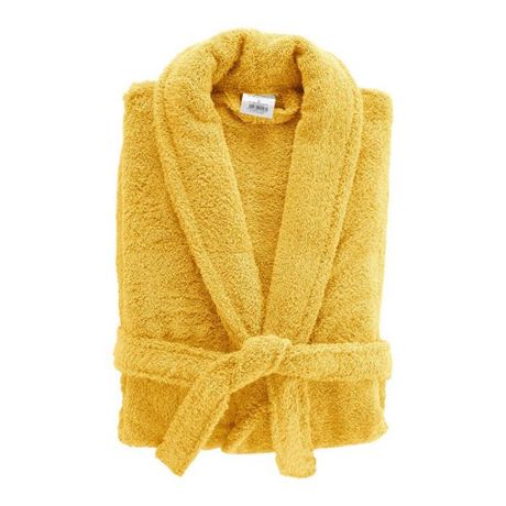 Informations Techniques : Dimensions : Produit Packagé : L. 33 x l. 12 x H. 50 cm Matière : 100% Coton (500g/m2) Spécificités : Pratique & Utile Peignoir Col Châle Taille Unique Texture Éponge Ceinture à Nouer 2 Poches Plaquées Poids : 1,52 kg Couleur : Mimosa