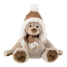 Informations Techniques : Dimensions : L. 32 x l. 21 x H. 30 cm Matière : 100% Polyester Spécificités : Douce & Utile Peluche ours Avec chapeau et écharpe Vendue à l'unité Poids : 0,23 kg Couleur : Marron
