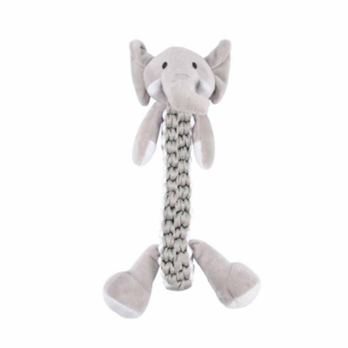 Informations Techniques : Dimensions : L. 34 cm Matière : Polyester Spécificités : Pratique & Efficace Peluche pour Chien Sonore Avec Corde Forme d'Éléphant Couleur : Gris