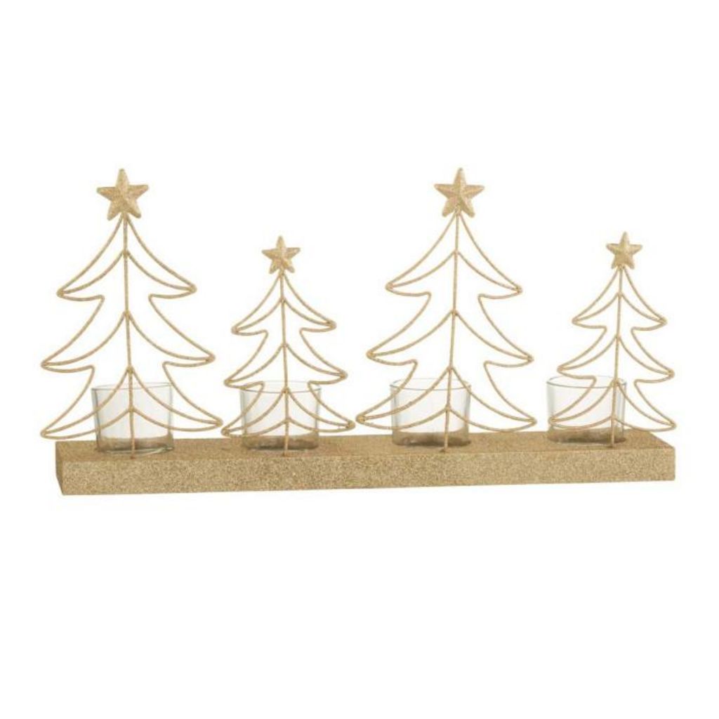 Informations Techniques : Dimensions : L. 38 x l. 19,5 x H. 7,5 cm Matières : 40% Verre, 40% Plastique & 20% Bois (Eucalyptus) Spécificités : Déco & Festif Photophore pailleté Avec 4 sapins décoratifs 4 emplacements pour bougie Bougies non incluses Poids : 0,73 kg Couleur : Or