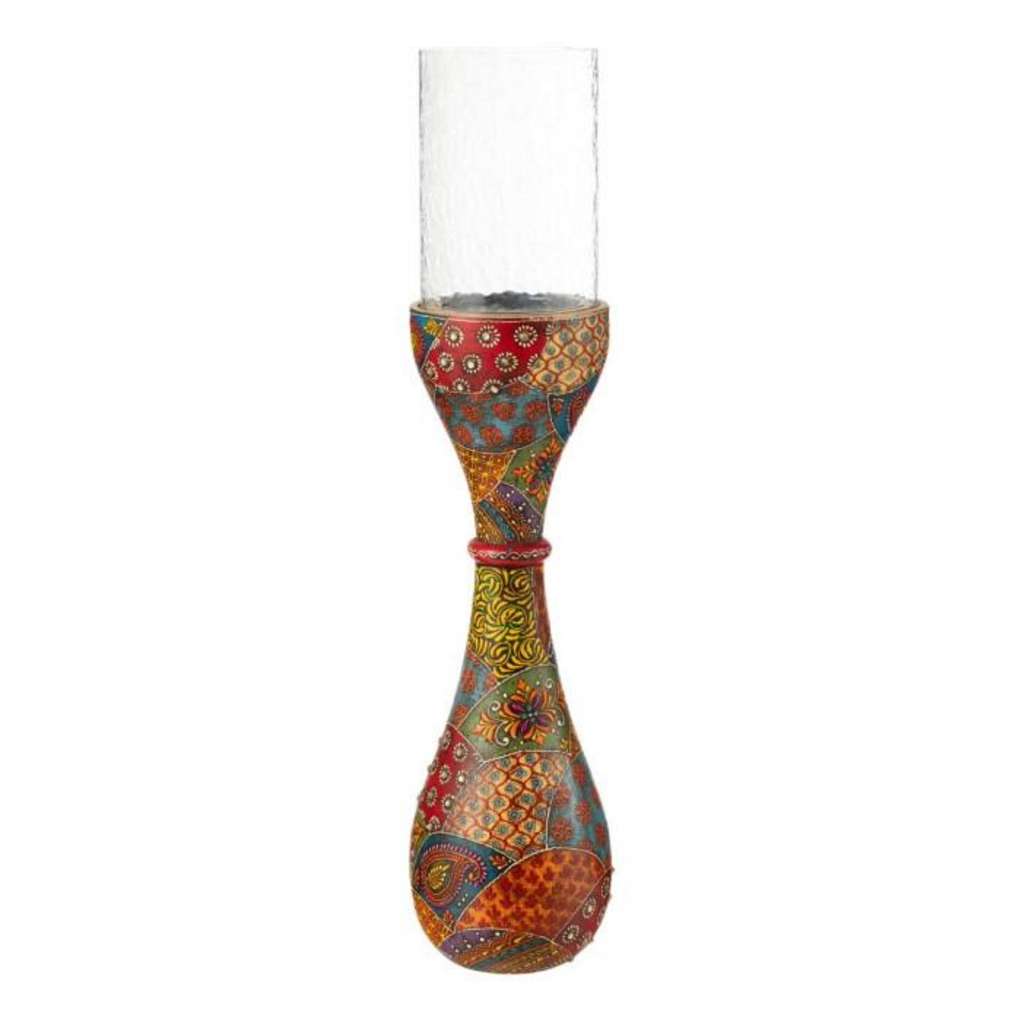Informations Techniques : Dimensions : L. 13 x l. 13 x H. 56 cm Matières : 90% Bois (Manguier) & 10% Verre Spécificités : Original & Utile Photophore déco Motif imprimé Bougie non incluse Poids : 1,8 kg Couleur : Multicolore