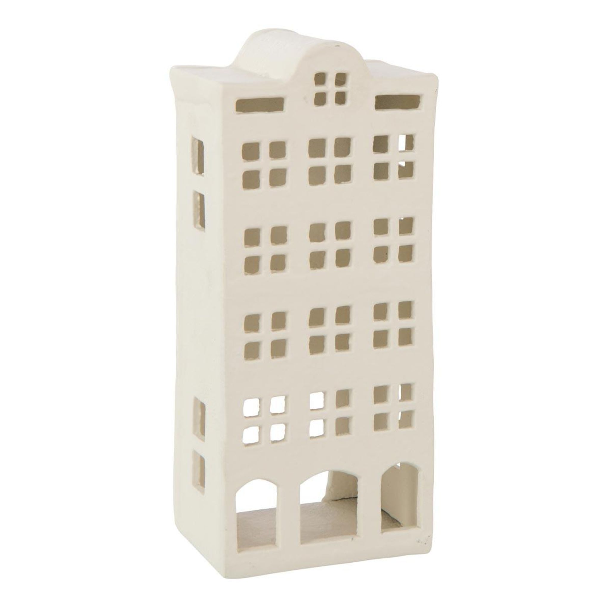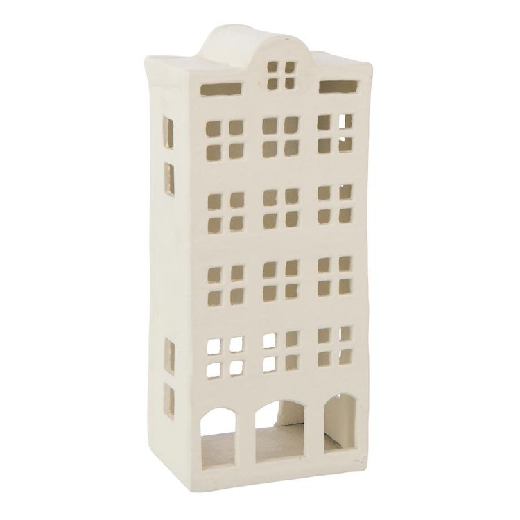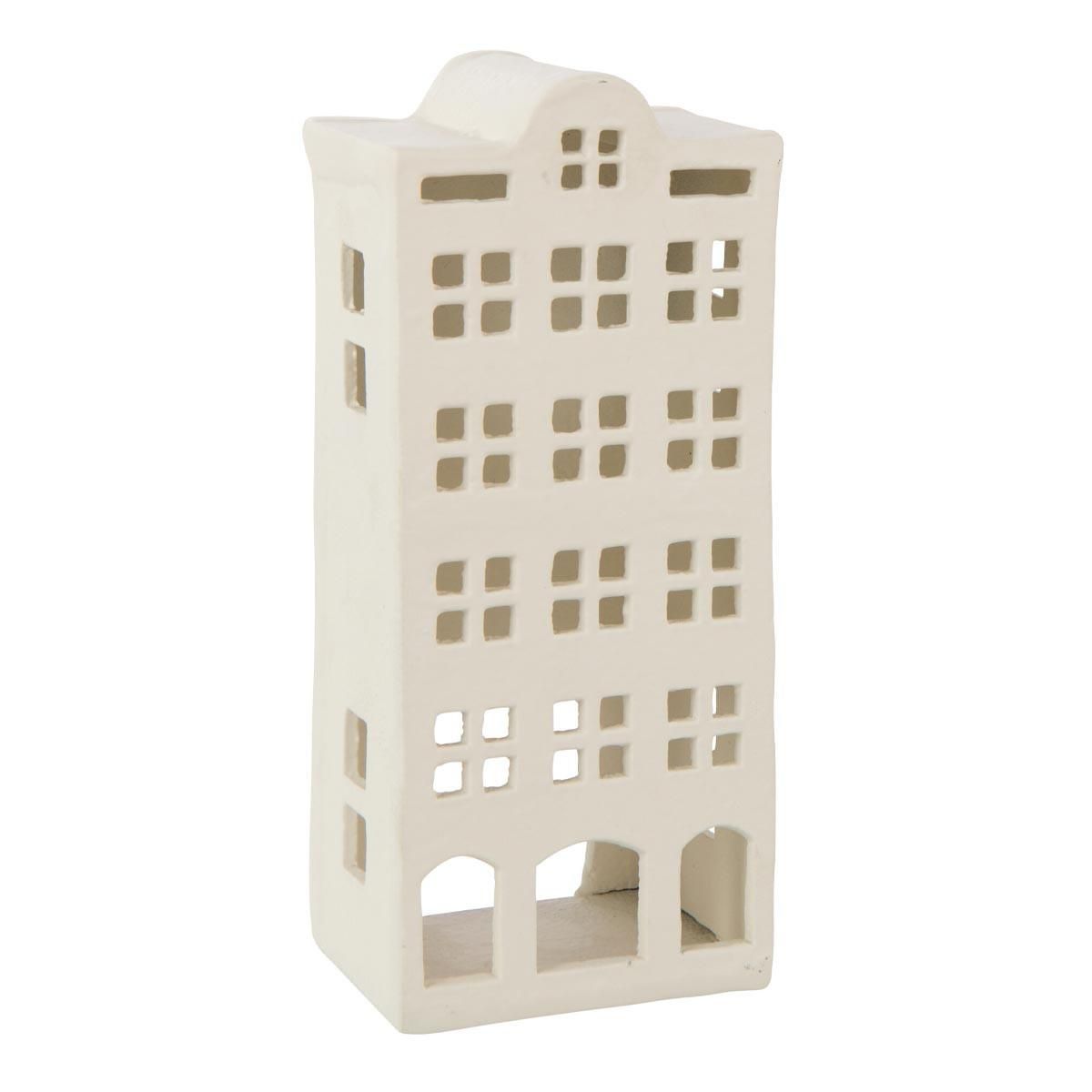 Informations Techniques : Dimensions : L. 9,2 x l. 6,2 x H. 21 cm Matière : 100% Métal Spécificités : Original & Utile Photophore déco En forme d'immeuble Bougie non incluse Poids : 0,56 kg Couleur : Blanc