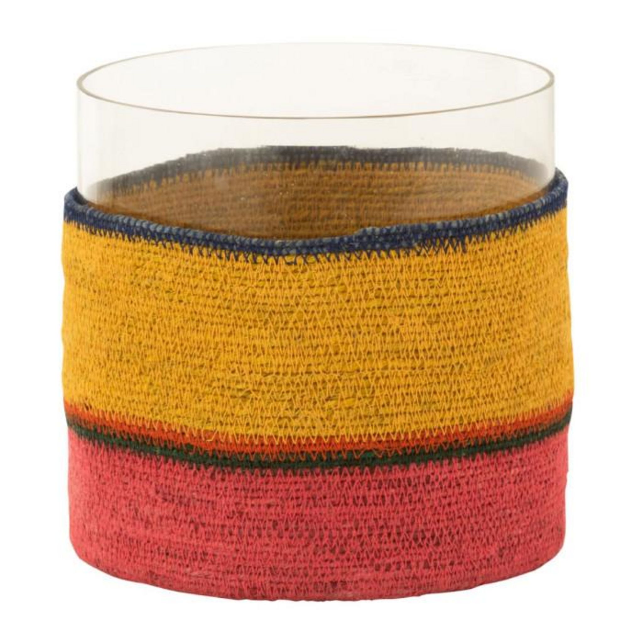 Informations Techniques : Dimensions : L. 20 x l. 20 x H. 20 cm Matières : 75 % Verre & 25% Jonc de mer Spécificités : Pratique & Tendance Photophore déco Design lignes Bougie non incluse Forme ronde Poids : 1,47 kg Couleur : Jaune & Rose
