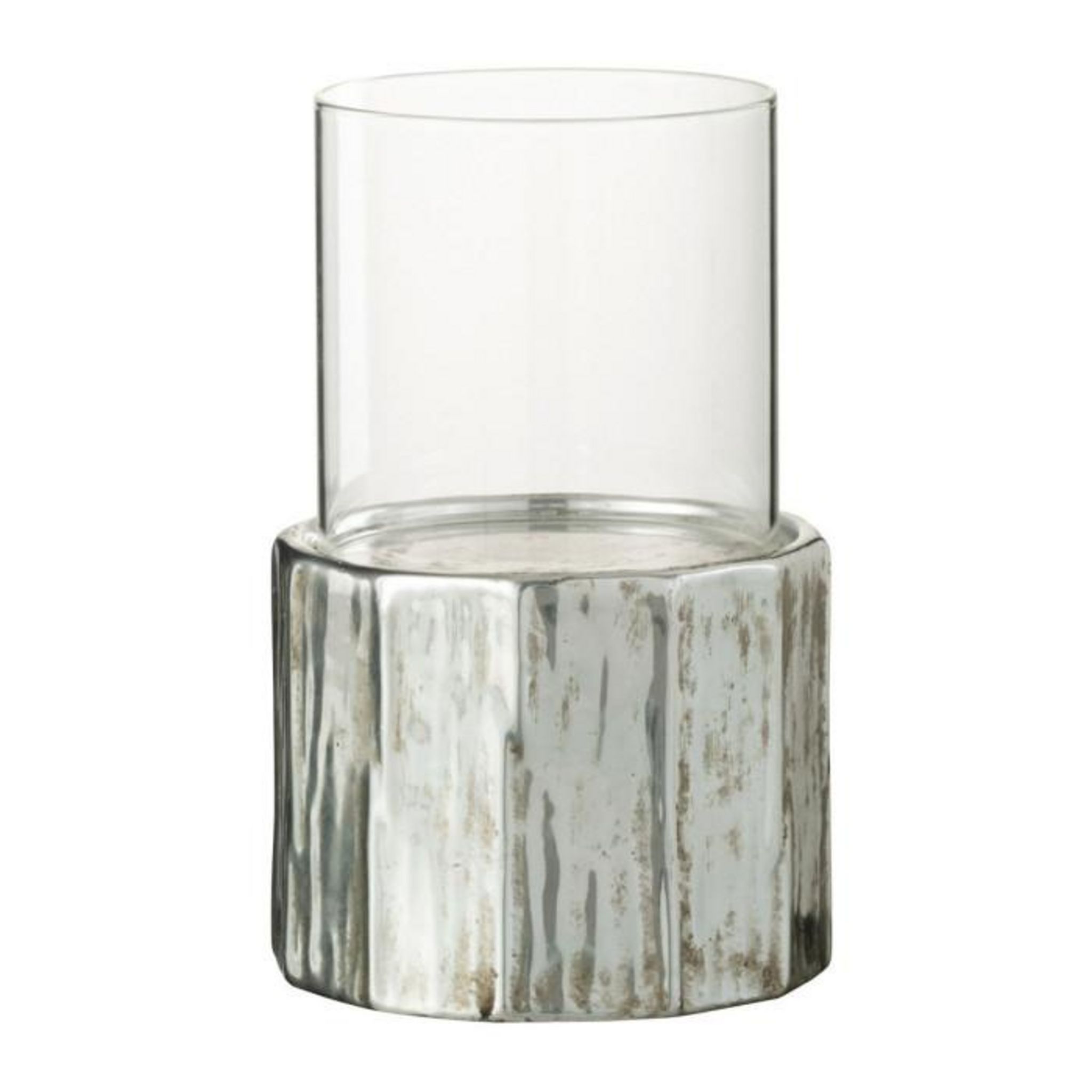 Informations Techniques : Dimensions : D. 14 x H. 23 cm Matière : Argile Spécificités : Déco & Utile Photophore design Forme ronde Bougies non incluses Poids : 1,12 kg Couleur : Argent