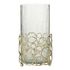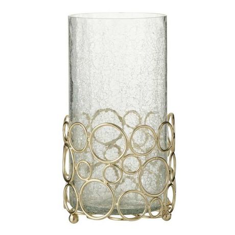 Informations Techniques : Dimensions : D. 15,2 x H. 32 cm Matières : 75% Verre & 25% Métal Spécificités : Élégant & Design Effet verre craquelé Cercles décoratifs Forme ronde Bougie non incluse Vendu à l'unité Poids : 1,91 kg Couleur : Transparent & Or