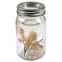 Informations Techniques : Dimensions : D. 8 x H. 13,5 cm Matière : Verre Spécificités : Chic & Tendance Photophore Design Forme Ronde Avec Couvercle Fleurs Séchées incluses Style Vintage Couleur : Transparent