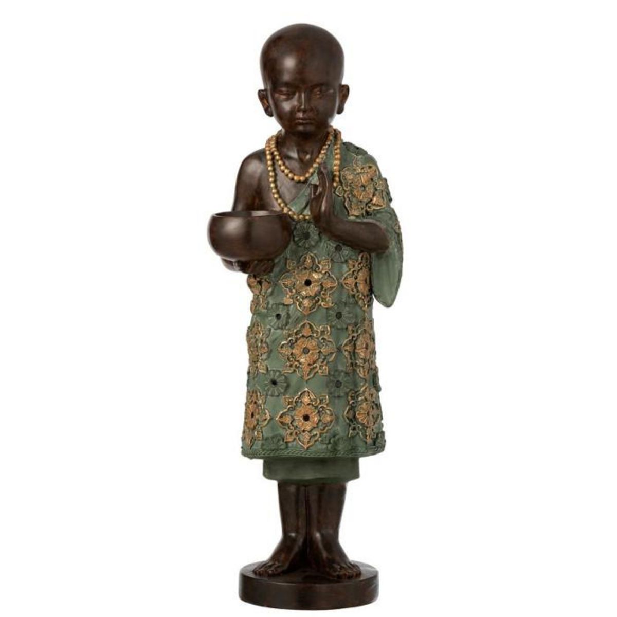 Informations Techniques : Dimensions : L. 22 x l. 21 x H. 58 cm Matières : Résine Spécificités : Moderne & Tendance Photophore design Forme Moine Poids : 2,32 kg Couleur : Vert & Or