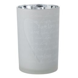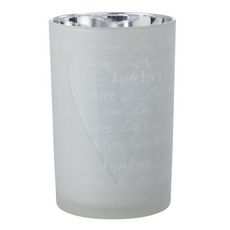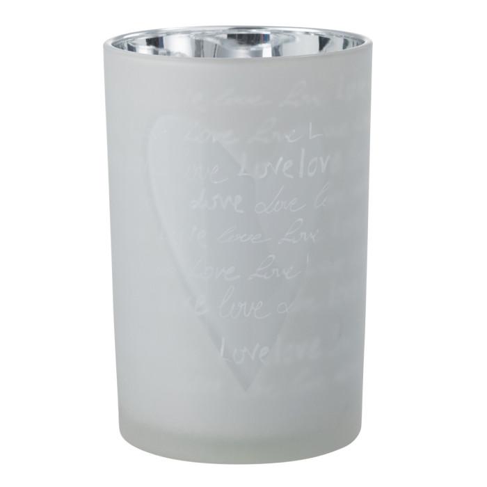 Informations Techniques : Dimensions : D. 12 x H. 18 cm Matière : Verre Spécificités : Pratique & Tendance Photophore Design Forme Ronde Inscription Love Poids : 1,05 kg Couleur : Blanc