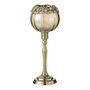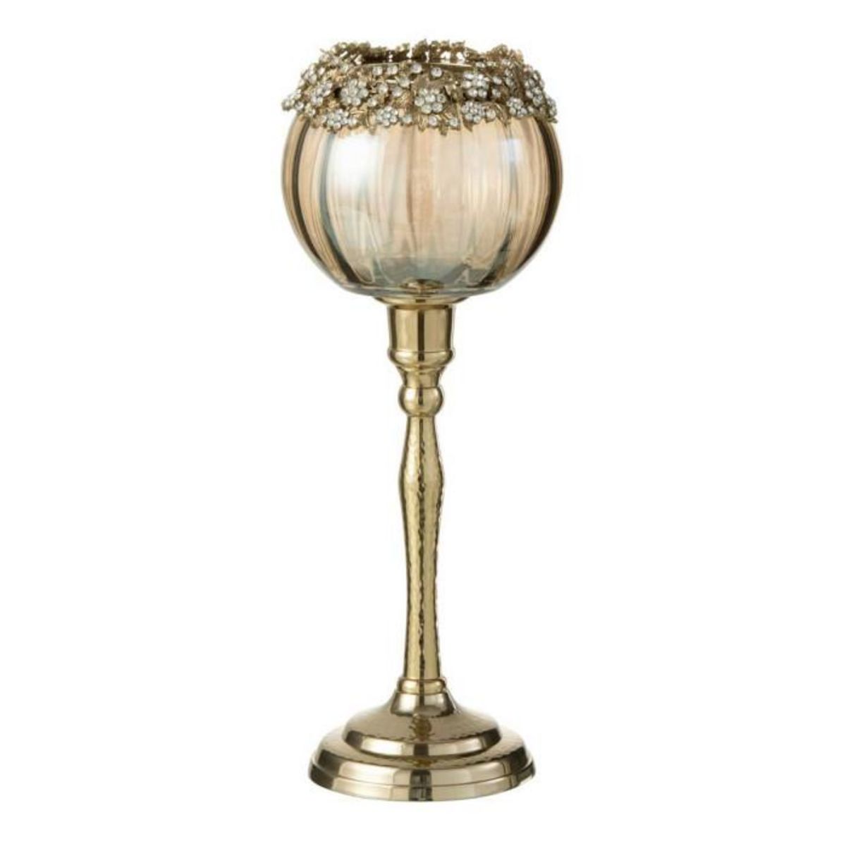 Informations Techniques : Dimensions : L. 10 x l. 7,6 x H. 33 cm Matières : 39% Verre, 31% Laiton & 30% Aluminium Spécificités : Design & Chic Photophore sur pied Détails floraux Forme ronde Bougie non incluse Vendu à l'unité Poids : 0,72 kg Couleur : Or & Bronze
