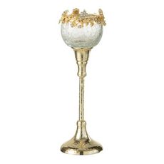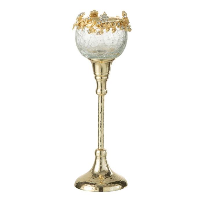 Informations Techniques : Dimensions : L. 8 x l. 5,7 x H. 25,4 cm Matières : 41% Laiton, 36% Aluminium & 23% Verre Spécificités : Chic & Déco Photophore sur pied Effet craquelé Détails floraux Bougie non incluse Vendu à l'unité Poids : 0,41 kg Couleur : Transparent & Or