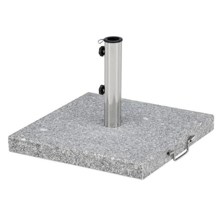 Informations Techniques : Dimensions : L. 50 x l. 50 x H. 27 cm Matière : Granite Spécificités : Pratique & Utile Pied de parasol carré Motif moucheté Avec poignée Poids : 40 kg Couleur : Gris