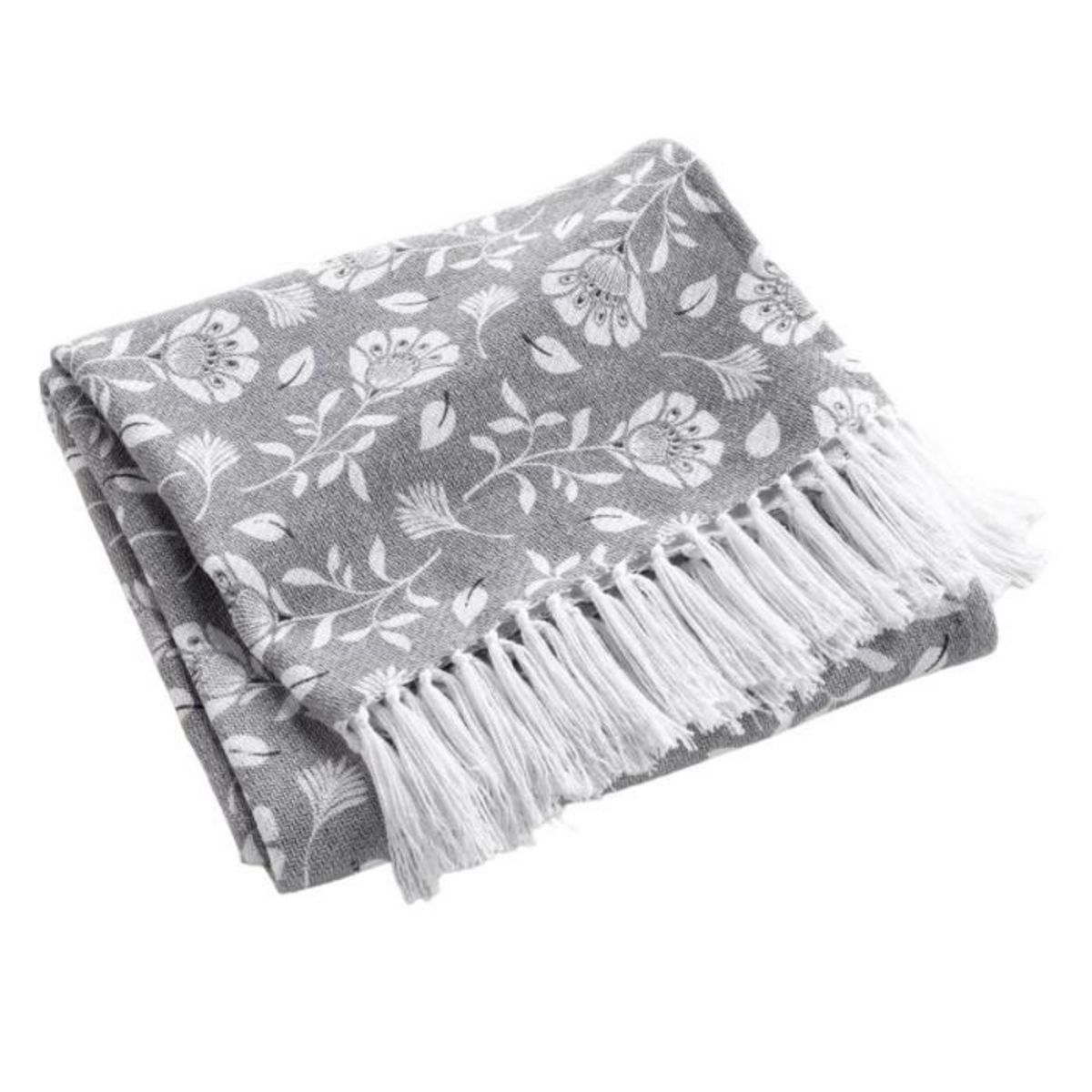Informations Techniques : Dimensions : L. 150 x l. 125 cm Matières : 80% Coton & 20% Polyester Spécificités : Déco & Romantique Plaid à franges Imprimé floral Certification Oeko-Tex Poids : 0,87 kg Couleur : Gris
