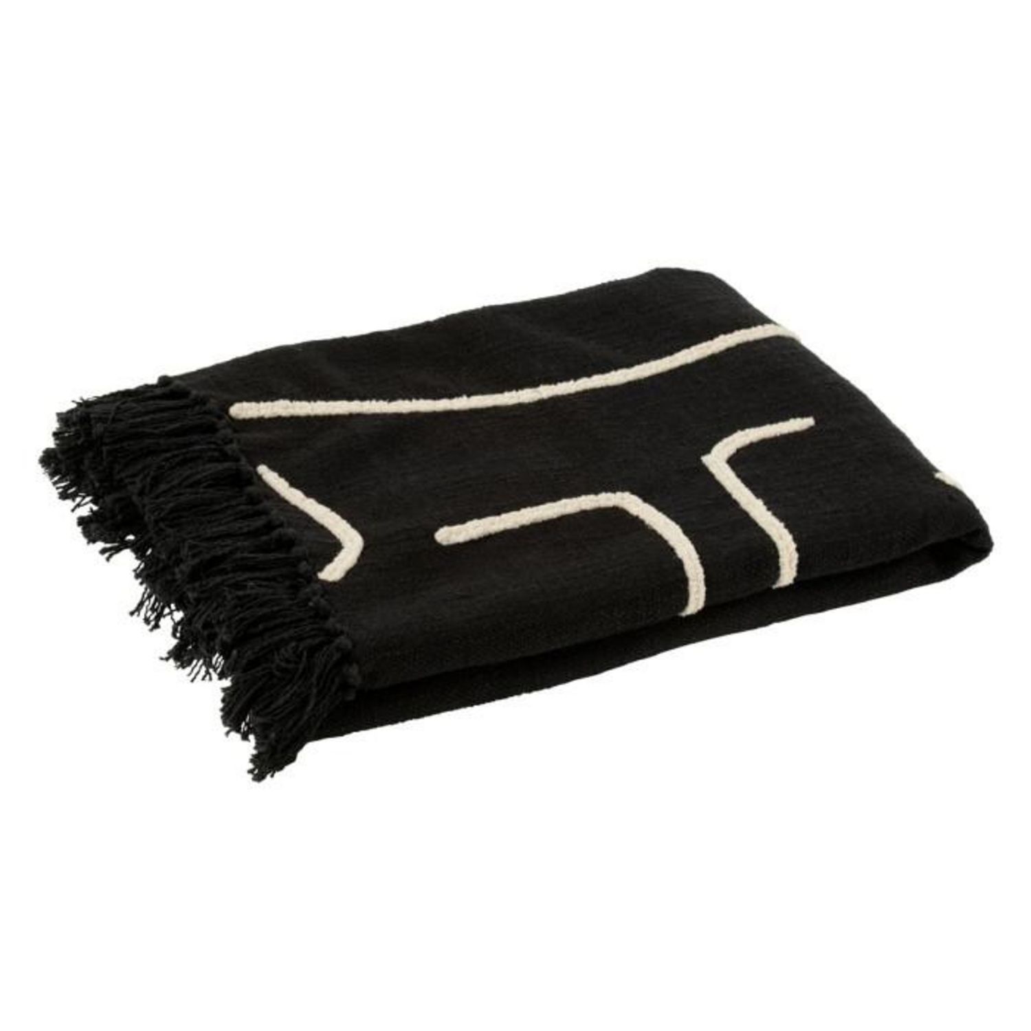 Informations Techniques : Dimensions : L. 180 x l. 130 x H. 1 cm Matière : 100% Coton Spécificités : Déco & Pratique Plaid rectangulaire Motifs géométriques Avec franges Nettoyage des taches uniquement Poids : 1,35 kg Couleur : Noir