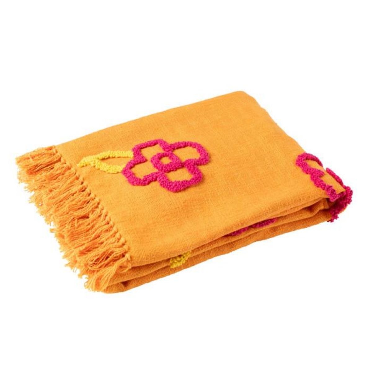 Informations Techniques : Dimensions : L. 180 x l. 130 x H. 1 cm Matière : 100% Coton Spécificités : Utile & Coloré Plaid tricolore Avec franges Motifs fleurs en relief Poids : 1,17 kg Couleur : Orange, Rose & Jaune