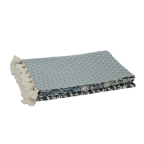 Informations Techniques : Dimensions : L. 180 x l. 130 x H. 1 cm Matière : 100% Coton Spécificités : Pratique & Tendance Plaid imprimé Avec pompons Motif fleurs Forme rectangulaire Poids : 0,74 kg Couleur : Bleu