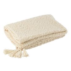 Informations Techniques : Dimensions : L. 180 x l. 130 x H. 1 cm Matière : 100% Coton Spécificités : Déco & Utile Plaid unicolore Avec pompons Nettoyage des taches uniquement Poids : 1,34 kg Couleur : Crème