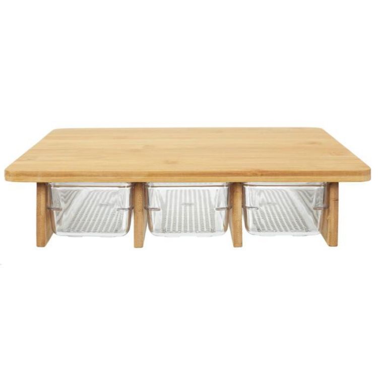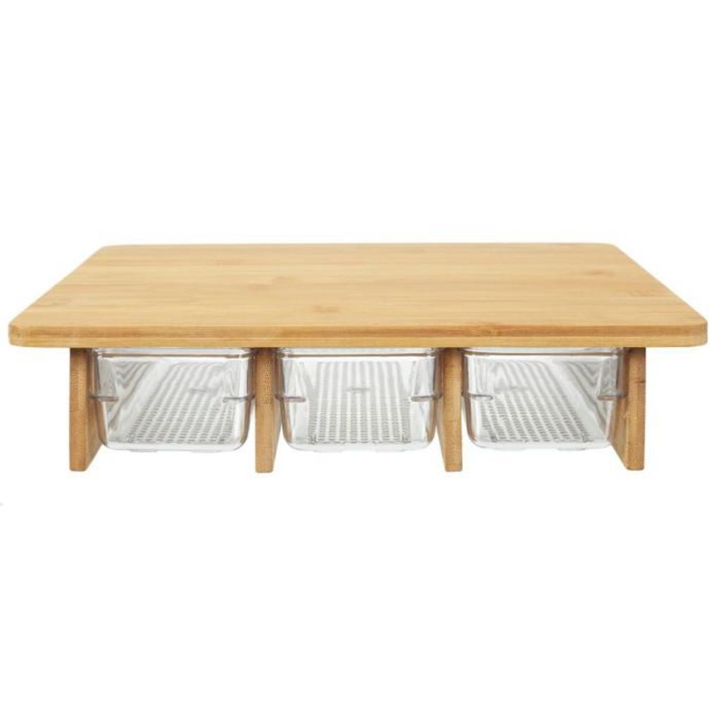 Informations Techniques : Dimensions : L. 32 x l. 25 x H. 7 cm Matières : Bambou & PET Spécificités : Pratique & Utile Planche à Découper Contient 3 Tiroirs Contenance : 60 cl Couleur : Transparent & Naturel
