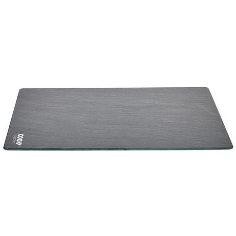 Informations Techniques : Dimensions : L. 40 x l. 30 x H. 0,4 cm Matière : Verre trempé Spécificités : Pratique & Utile Planche à Découper Forme Rectangulaire Design Effet Ardoise Poids : 1,15 kg Couleur : Noir