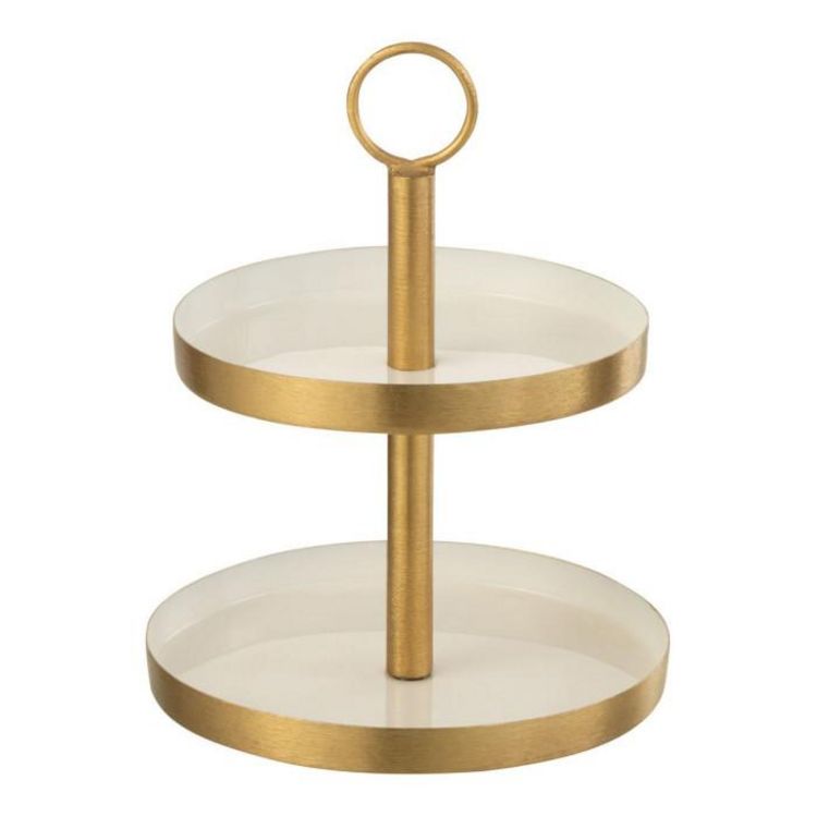 Informations Techniques : Dimensions : D. 13 x H. 17 cm Matière : 100% Métal Spécificités : Déco & Pratique Plateau de présentation Avec 2 niveaux Forme ronde À monter soi-même Poids : 0,63 kg Couleur : Blanc & Or