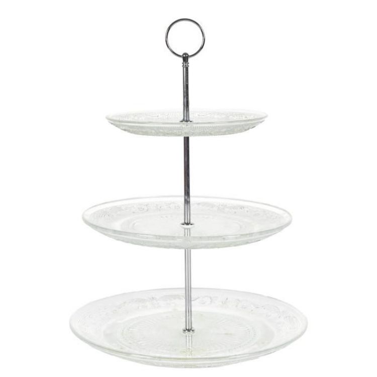 Informations Techniques : Dimensions : D. 25 x H. 35 cm Niveau 1 : D. 15 cm Niveau 2 : D. 20 cm Niveau 3 : D. 25 cm Matière : 95% Verre & 5% Métal Spécificités : Utile & Élégant Plateau de présentation Avec 3 niveaux Forme ronde Poids : 1,4 kg Couleur : Transparent