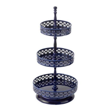 Informations Techniques : Dimensions : D. 21 x H. 55 cm Matière : 100% Métal Spécificités : Élégant & Robuste Plateau de présentation rond Avec 3 niveaux À monter soi-même Poids : 1 kg Couleur : Bleu