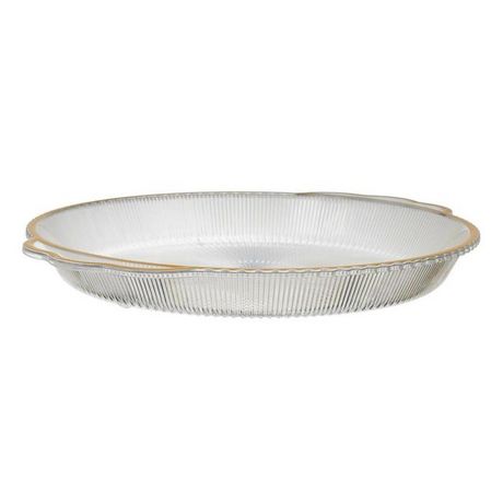 Informations Techniques : Dimensions : D. 38,5 x H. 4 cm Matière : Plastique Spécificités : Élégant & Pratique Plateau de service design Avec liseré doré 2 poignées latérales Forme ronde Compatible : Lave-vaisselle Poids : 0,32 kg Couleur : Transparent